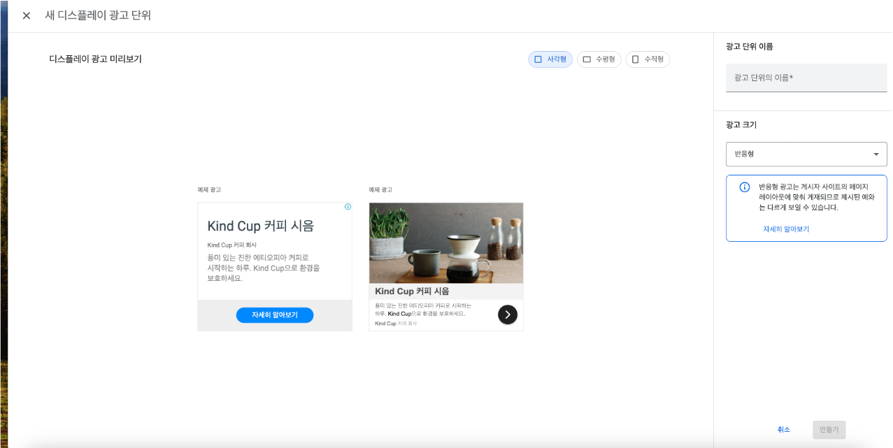 '디스플레이 광고'를 클릭하시면 아래의 화면을 보실 수 있습니다.