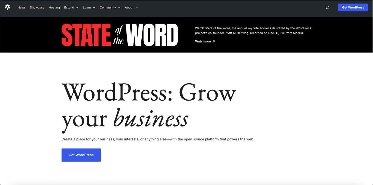 워드프레스 사이트 (wordpress.org)에 들어가시면 첫 화면은 아래와 같습니다. (다 아시는 사실이겠지만 직접 호스팅을 하시려면 wordpress.com 이 아닌 wordpress.org로 접속하셔야 합니다.)